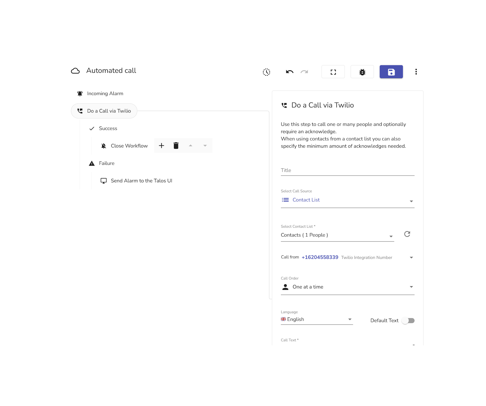 Operators can place calls directly from the alarm or workflow view without switching tools or searching for numbers.