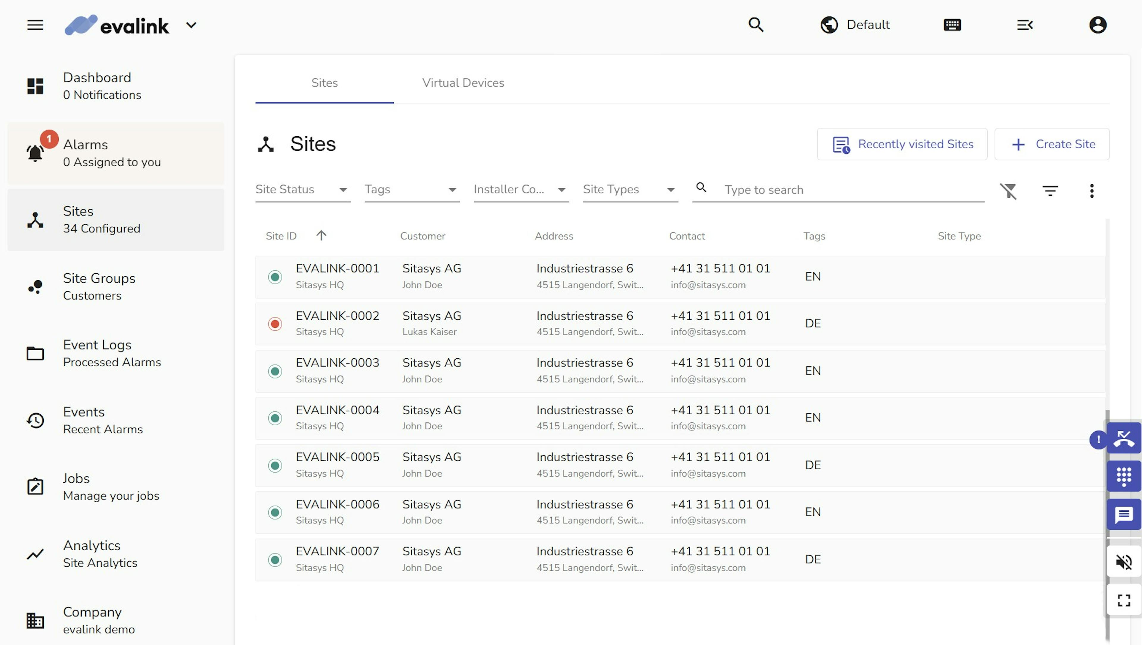 evalink brings all your monitored objects: Buildings, retail stores, vehicles, mobile units or single-device installations. Every site, site group and service company follows the same logic, ensuring clean data, consistent automation and a scalable operational foundation.